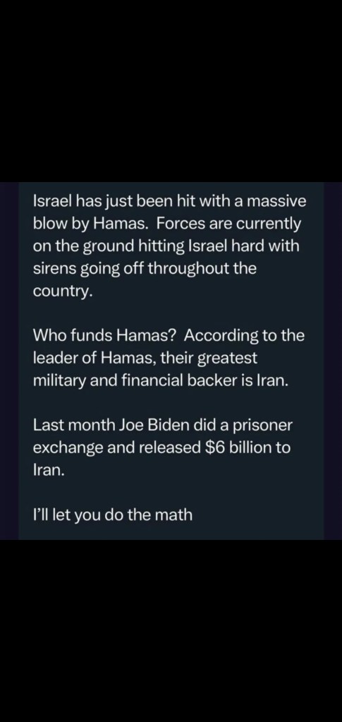 “As I successfully fight these Political Opponent Lawsuits, all created and started by Crooked Joe Biden and his group of Radical Left Thugs, I realize how insignificant they are compared to the horror of what is going on with Israel and the Middle East, where thousands of people have so needlessly died, in a war that should have never started, and millions could very easily follow, all due to the highly incompetent Biden Administration and their policies of Weakness and Appeasement (and of being just plain stupid!),” Trump began.